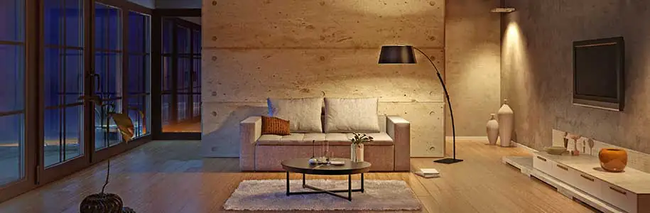 Im Innenbereich Ihres Heims sollten Sie darauf achten, welche Atmosphäre im jeweiligen Raum kreiert werden soll. Im Schlafzimmer ist eine angenehme Farbtemperatur von < 2.700 Kelvin optimal, da das Licht extra warmweiß ist und zum Entspannen einlädt. Eine warmweiße Farbtemperatur (2.700 bis 3.300 Kelvin) kann beispielsweise im Wohnzimmer genutzt werden. Achten Sie in jedem Fall auf eine hohe Farbwiedergabe ( > 90 Ra), damit angestrahlte Farben natürlich und nicht etwa matt oder glanzlos wirken. Das ist besonders in der Küche wegen der Lebensmittel wichtig. Es reicht aus, in jedem Raum eine Grundbeleuchtung zu haben, die mit dem Hauptlichtschalter verbunden ist. Allerdings kann auch eine Zonenbeleuchtung ein angenehmes Ambiente erzeugen, da das Licht beispielsweise einer Stehlampe nur in ihrem Bereich breitflächig den Teil des Raumes erhellt.