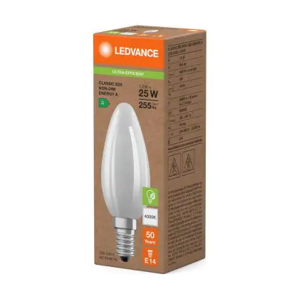 Die Ledvance LED Classic E14 Kerze Fadenlampe Matt 1.2W 255lm - 840 Kaltweiß | Ersatz Für 25W ist eine effiziente E14 LED-Lampe mit Retrodesign und der perfekte Ersatz für Ihre konventionellen 25W Lampen mit E14. Zudem strahlt sie Licht in der Farbtemperatur 4000K - Kaltweiß aus und punktet durch eine lange Lebensdauer.
