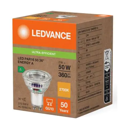 Die Ledvance LED PAR16 GU10 Reflektor 2W 360lm 36D - 827 Extra Warmweiß | Ersatz Für 50W ist eine effiziente GU10 LED-Lampe und der perfekte Ersatz für Ihre konventionelle Halogenlampe mit 50W und einem GU10-Sockel, bei welchem die zwei Stifte einen Abstand von 10 mm zueinander haben. Zudem strahlt das Produkt Licht in der Farbtemperatur 2700K - Extra Warmweiß aus und punktet durch eine lange Lebensdauer.