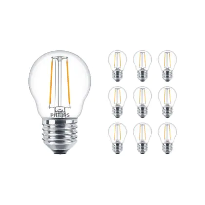 Die Mehrfachpackung 10x Philips Corepro LED Lustre E27 Kugel Fadenlampe Klar 2W 250lm - 827 Extra Warmweiß | Ersatz für 25W ist eine effiziente E27 LED-Lampe mit Retrodesign und der perfekte Ersatz für Ihre konventionellen 25W Lampen mit E27. Zudem strahlt sie Licht in der Farbtemperatur 2700K - Extra Warmweiß aus und punktet durch eine lange Lebensdauer.