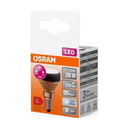 Die Osram LED Eben Lamp E14 Special Matt 3.5W 270lm - 840 Kaltweiß | 3-Stufen Dimmbar - Ersatz Für 25W ist eine effiziente E14 LED-Lampe und der perfekte Ersatz für Ihre konventionellen 25W Lampen mit E14-Sockel. Zudem strahlt sie Licht in der Farbtemperatur 4000K - Kaltweiß aus und punktet durch eine lange Lebensdauer.