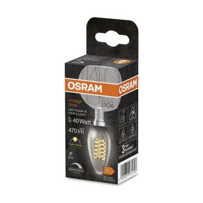 Die Osram Vintage 1906 LED Classic Slim E14 Kerze Fadenlampe Klar 4.8W 470lm - 827 Extra Warmweiß | Dimmbar - Ersatz Für 40W ist eine effiziente E14 LED-Lampe mit Retrodesign und der perfekte Ersatz für Ihre konventionellen 40W Lampen mit E14. Zudem strahlt sie Licht in der Farbtemperatur 2700K - Extra Warmweiß aus und punktet durch eine lange Lebensdauer.
